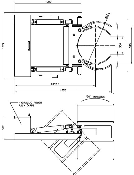 The DC-GR2/HPP unit is fitted with a self contained battery / electric operated hydraulic power pack, eliminating the need to connect to the hydraulic system of the Forklift.