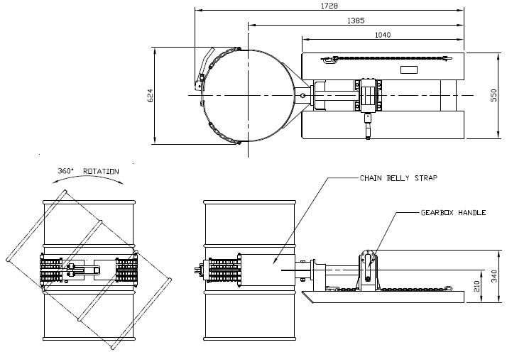 This unique rotator allows for sideways drum rotation without need for hydraulics.